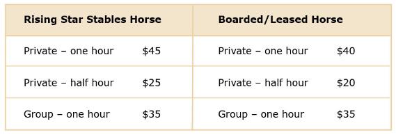 Monthly, hourly working and exercising under saddle rates will be mutually agreed upon in